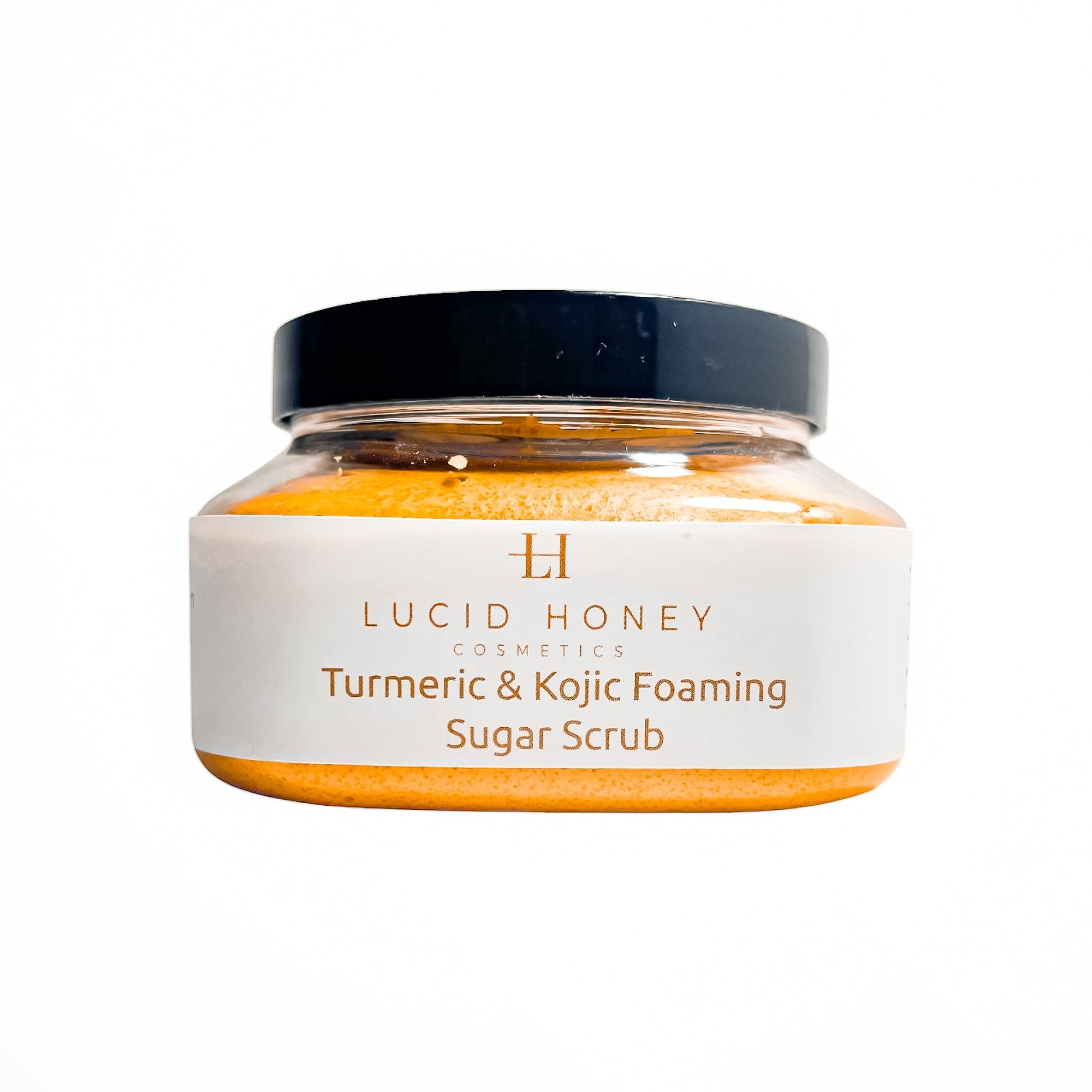 Ingredients: Sugar, Glycerin, Water, Jojoba Oil, Sodium Cocoyl Isethionate, Sorbitol, Propylene Glycol, Disodium Lauryl Sulfosuccinate, Stearic Acid, Sodium Chloride, Diazolidinyl Urea, Iodopropynyl Butylcarbamate, Essential Oil, Turmeric Powder, and Kojic Acid Powder.